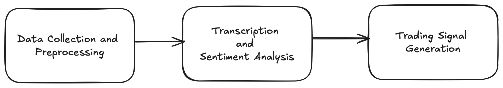 We apply these techniques to analyze the sentiment of Federal Reserve (Fed) press conference speeches, generating trading signals based on that sentiment. Below you can see the general pipeline of this system: